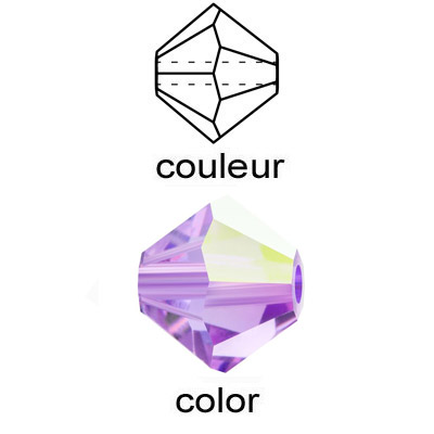 Billes de verre Preciosa coupées à la machine, 4x4mm, bicône, grandeur de trou approx. 0.95mm, violet AB. Vendu en paquet de 144. (SKU# GBMC4X4/536)