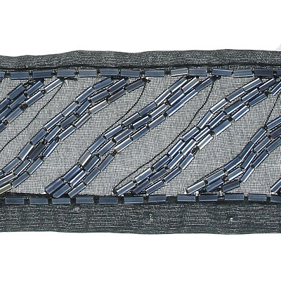 Fringe gun metal bugle bead pattern on black organza (SKU# SMF1089/GM). Minimum order is 1 yard.