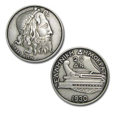 Metal pendants, 30mm, Greek coin, Poseidon and galley, antique silver. (SKU# MP3732/OXWH). Sold per pack of 5