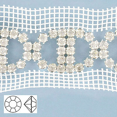 Rhinestone banding, fancy bow 2 side white net crystal machine cut (SKU# RBM944W2N101). Minimum order is 1 meter.