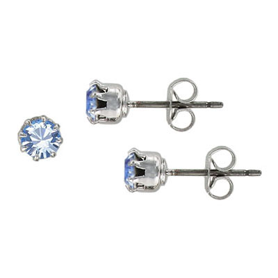 Swarovski titanium earposts, birthstone crystal earrings, light sapphire color, ss19 size. December birthstone, rhodium plate. (SKU# RER/SS19/217R). Sold per pack of 6