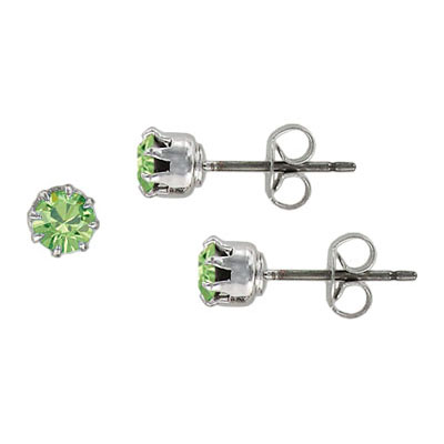 Swarovski titanium earposts, birthstone crystal earrings, peridot color, ss19 size. August birthstone, rhodium plate. (SKU# RER/SS19/222R). Sold per pack of 6